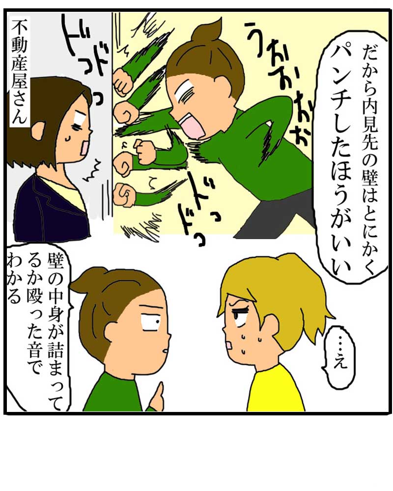 詰まってない物件はコンコーン!と高く薄っぺらい音が鳴りますが、詰まっている壁だと、ズン、ズン・・・と低い詰まった音がしますね!