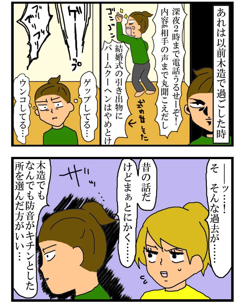以前木造に住んだとき壁がテッシュペーパー並みに薄かったので何もかもが丸聞こえで、木造の集合住宅を憎んでいる節がありますね。勿論私がケチったが故にそのような隣人の屁からクソから何まで筒抜けになったのですが。隣人が彼氏と結婚式の打ち合わせを電話でしてて、引き出物のバームクーヘンをどれにするかばかり話していた時にはもううんざりでした。食い飽きとるぞ!