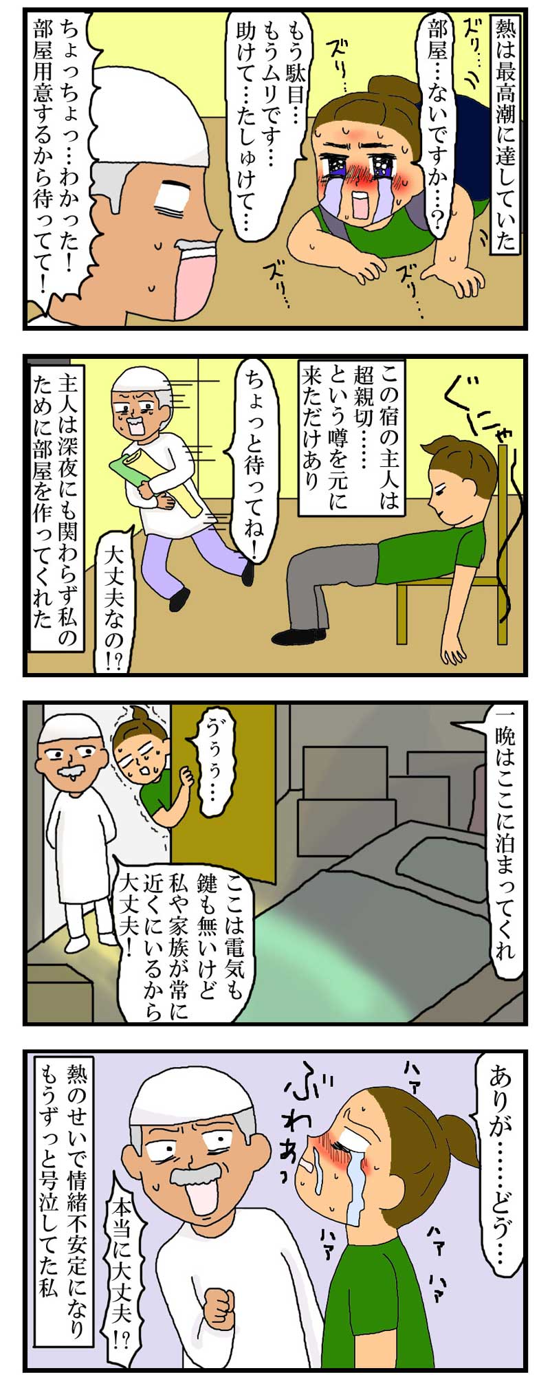 モロッコで死ぬっぽいし遺書でも書く。part5 モロッコで助けを求める日本人 2020年06月22日 前回の話→(1話 2話 3話 4話)やっと宿に到着したけど満室でした・・・。ありが・・・とう・・・夜中だってのに断る宿の主人は普通に断りますからね。何度も断られた経験ありますので・・・。なのにここの主人は満室なおかつ、ハァハァ言ってるわけのわからんヤベえ日本人を泊めようとしてくれたわけですから。普通宿泊させんて。つまりこれで何が判明したかというと・・・聖人はそこらへんの市民の中にいる。それにしてもいつもギリギリで生きている気がします。→6話へすすむにほんブログ村 < 前の記事次の記事 > コメント コメント一覧 (6) 1. 梓 2020年06月22日 19:49 優しさが、染みますね泣 0 小西 がしました 4. 小西 2020年06月23日 15:03 >>1優しかったです…!何回ありがとうと言ったことか! 0 小西 がしました 2. ぽん 2020年06月22日 20:06 よい人に出会えて良かった… 0 小西 がしました 5. 小西 2020年06月23日 15:05 >>2 いい人に救われる人生です…!自分も誰かにとってのいい人になりたいと思わせてくれる出来事でした! 0 小西 がしました 3. にゃんこ 2020年06月22日 21:01 こんばんは! 熱が出ると、涙も出ますよね。 小さい時はなんで悲しくないのに 涙が出るのか不思議でした。 私的結論としては、 感情は関係なく、苦しいからでもなく、 少しでも熱を下げようとする 生理現象ではないかと思ってます。 ほんまかいなー?笑 このまま休んで熱が下がると 遺書にたどりつけません! さらなる悲劇が?! 0 小西 がしました 6. 小西 2020年06月23日 15:06 >>3 生理現象もあるし、発熱の時って感情が揺れ動きまくるのもありそうな気がします。少しのことでうわあああああああってなります…!私だけかもしれませんが。 さらなる悲劇があったりなかったりします! 0 小西 がしました コメントフォーム 名前 コメント 記事の評価 リセット リセット 顔 星 情報を記憶 コメントを投稿する